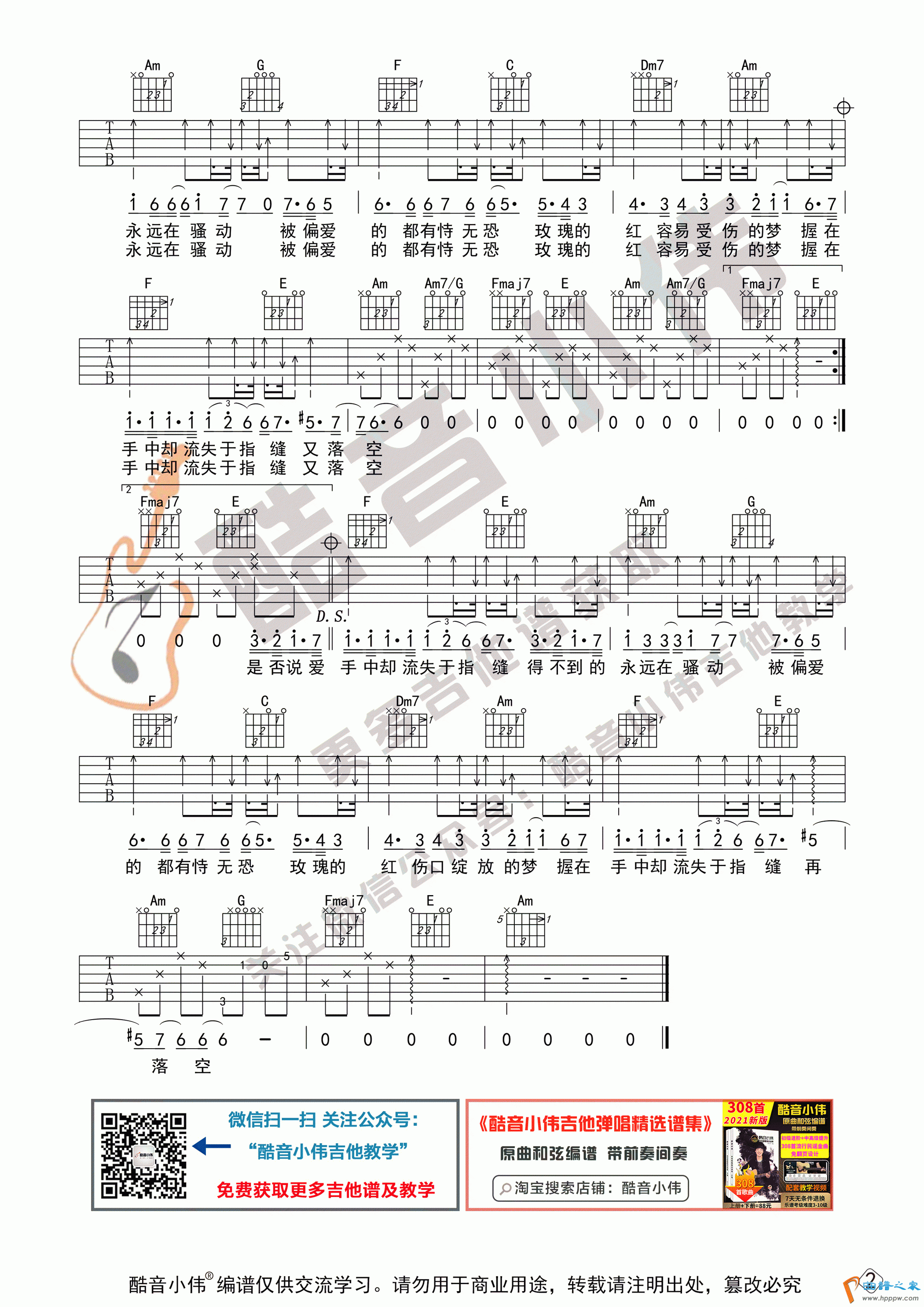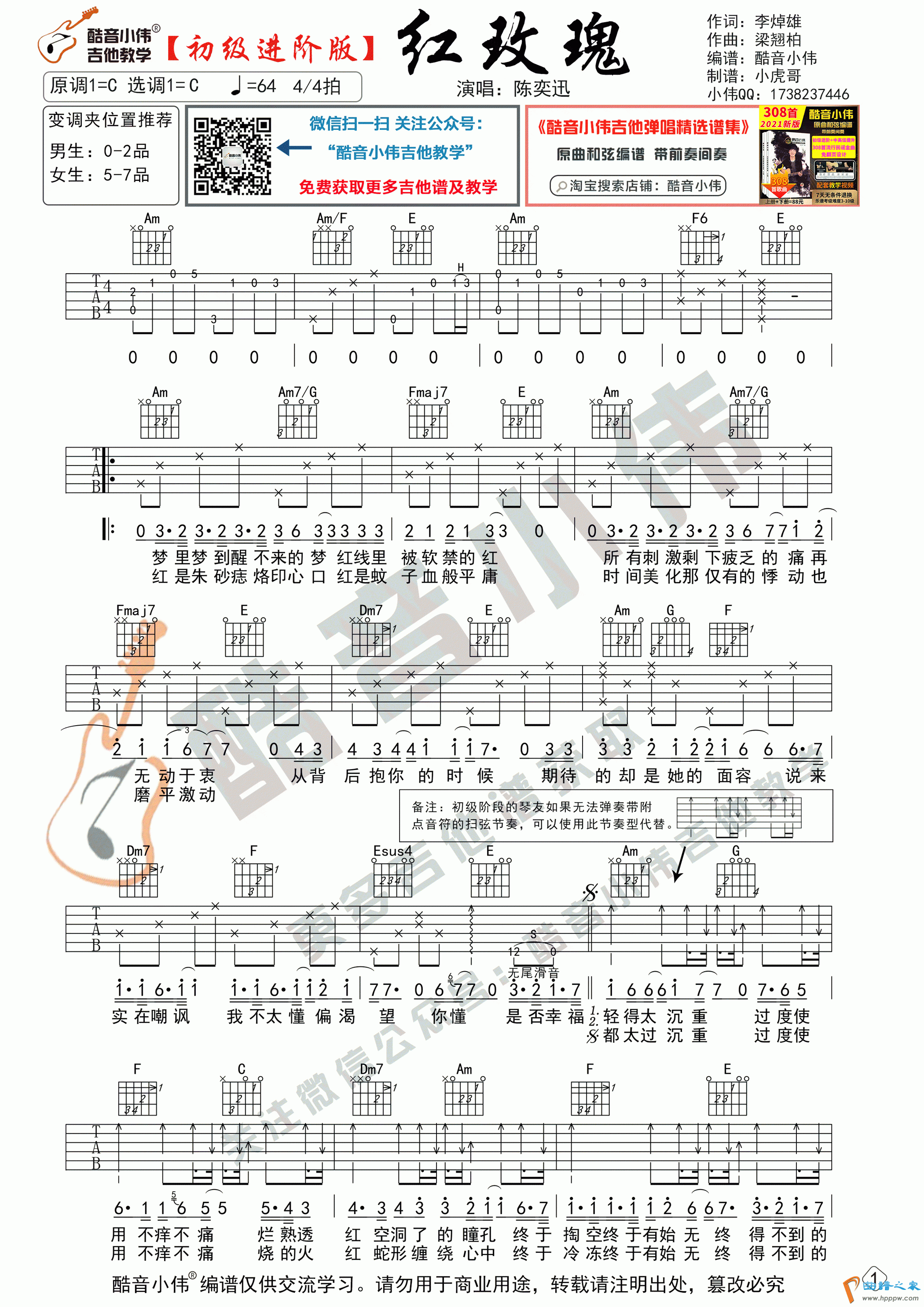 《红玫瑰》吉他谱初级进阶版 带教学视频(酷音小伟吉他教学)