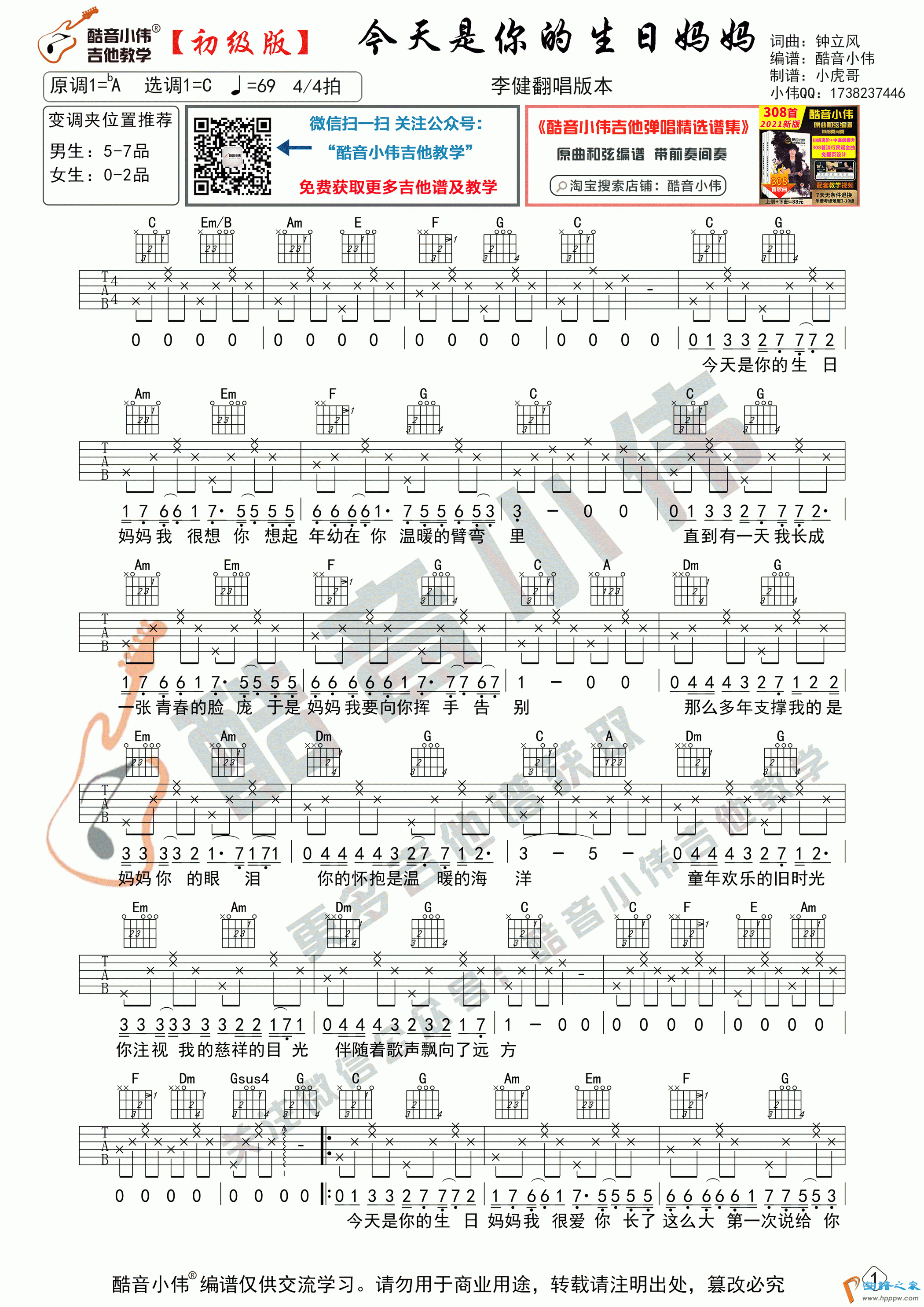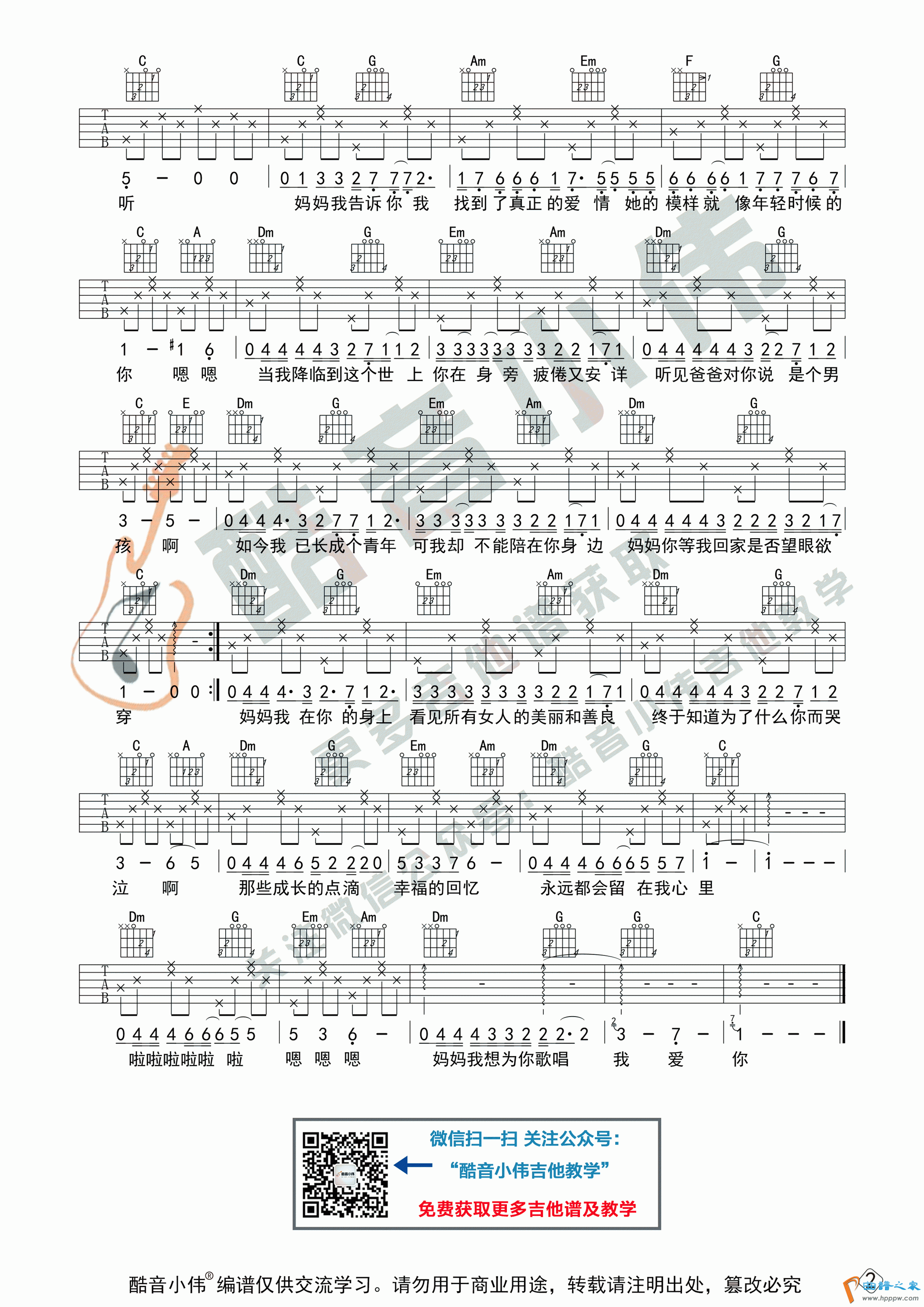 《今天是你的生日妈妈》吉他谱初级版(酷音小伟吉他教学)