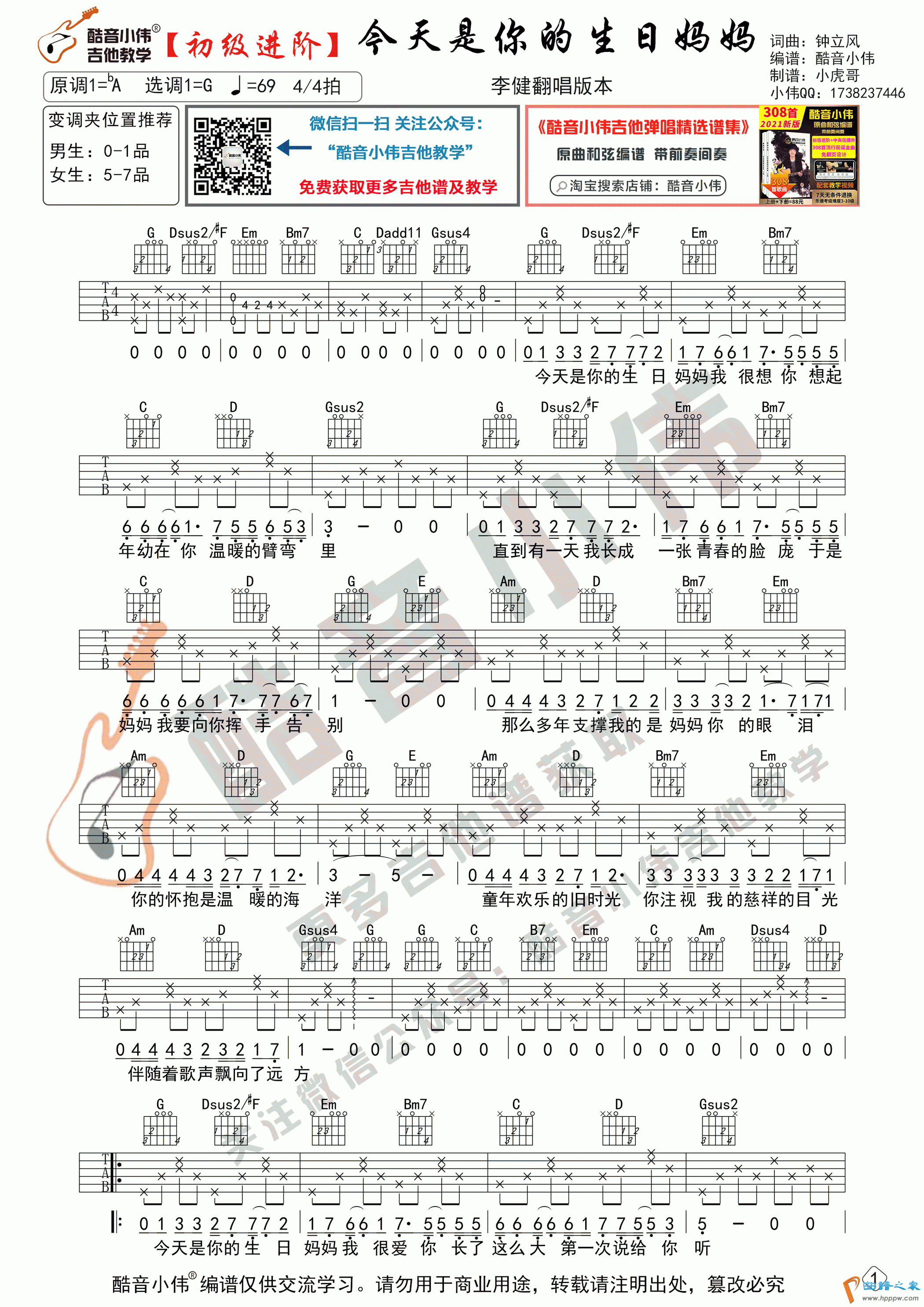 《今天是你的生日妈妈》吉他谱初级进阶版(酷音小伟吉他教学)