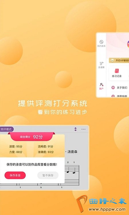 伴随评测,识别弹奏的琴声,弹到哪里笑谱翻到哪里!每次评测有分数反应,许多笑谱见证你的每一次进取~