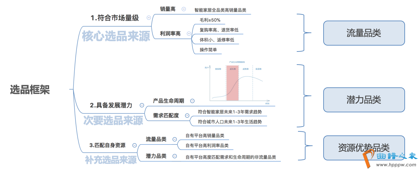 下图选品框架是正在做智能家居选品时策画的,选品经过是次第筛选三个品类:流量品类包蕴了引流、利润两个品类;潜力品类即发达品类;资源上风品类是从下降本钱的角度,发现本平台已有的可优先纳入。