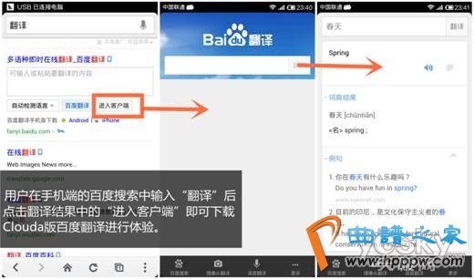 用户正在百度客户端中搜罗“翻译”,点击搜罗结果中的“进入客户端”即可下载Clouda版百度翻译举行体验。下载结束后,再次点击“进入客户端”激活调起,直接翻开。