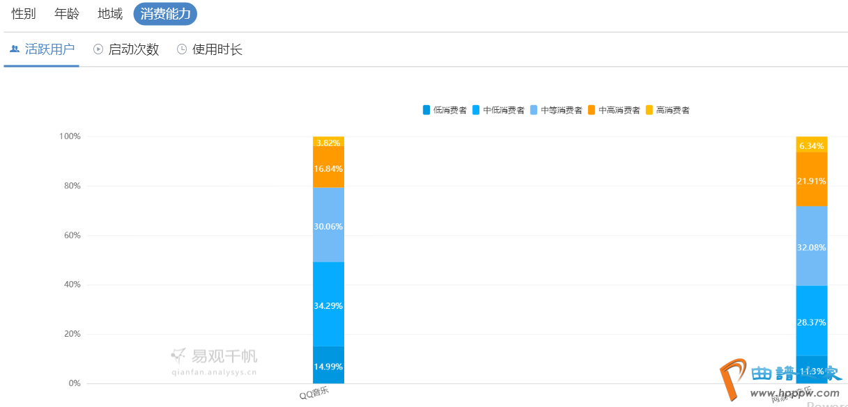 网易云音笑中高消费才智用户占比28%,高于的20%,完全来看,网易云音笑的用户消费才智更强。