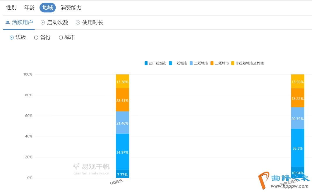 从上图可见,两款APP的用户重合率惟有2。28%,这样低的重合率源于产物的类型,分别于其他类型产物如电商类或者社交类,用户会下载并利用多个产物,由于分别的产物各有着重,能够知足用户分别的需求。而对待转移音笑产物,用户习俗了一款APP考试另一款的意图会很低,由于两款产物管理的需求大致相通,大凡来说用户不会本日听,翌日用网易云音笑,像如许两款APP换着用。以是对待网易云音笑来说念要从手里抢走用户必需超越我方的分歧化逐鹿上风,弯道超车,不然是很难跟这个巨头逐鹿的。