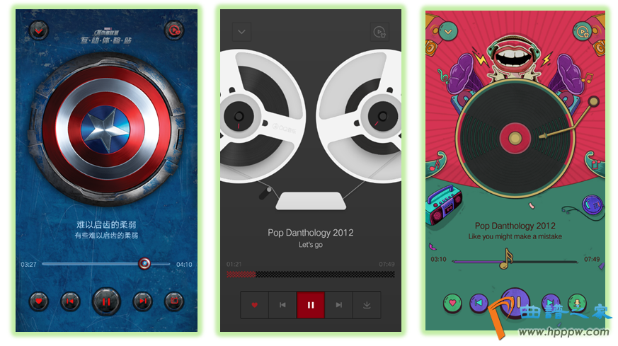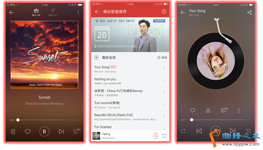 音笑播放器是一款音笑类APP的重点模块,也是被利用频率最高的模块,其主要性不问可知。两款产物的结构大致彷佛,上方是歌曲音讯,播放器中心是一张扭转的光盘,而网易云音笑则是一张扭转的黑胶唱片和留声机唱针,唱针会跟着歌曲的播放和暂停而行动,拥有古典情怀。下方是少许功效操作按钮,便利用户手指操作。