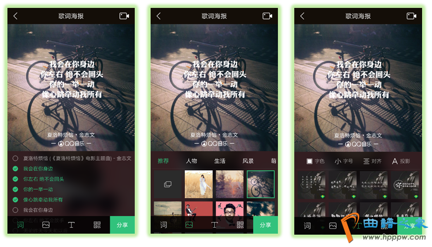 用户能够遵照对音笑的理会和我方的锺爱性子化筑造歌词海报用于分享,如选拔歌词、选拔图片、选拔字体,然后配一个二维码。图片唯美,文艺范全部。分享给别人的时辰,别人识别二维码能够直接播放,无需下载。操作简易,结果显然,让用户有更多的参加感,饱动用户分享。