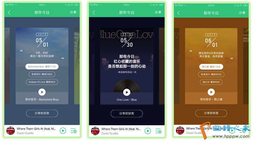 那年今日志实了用户行走正在道道上的点点滴滴。就像哆啦A梦的邪法口袋,一个满载回顾的老照片,音笑一响起,回顾的画面持续回放。进入“那年今日”页面,用户会发明每张卡片安排精巧,加之卡片式的横向活动,安排感全部,让用户很容易就能印象起当时听这首歌的画面和神情。