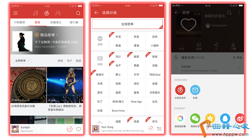 歌单是网易云音笑的另一个重点功效,分类赶过70种,而且将创筑歌单的权柄交给用户,让用户自行缔造,并会遵照用户口胃针对性地推送优质歌单。用户也能够将我方创筑的歌单分享给其他用户以至其他社交平台,抵达音笑社交的目标,从而也吸引其他用户插足网易云音笑,起到拉新的影响。网易云音笑正在起先恰是通过此种格式火速积蓄洪量用户,至今不断保留这个特性。