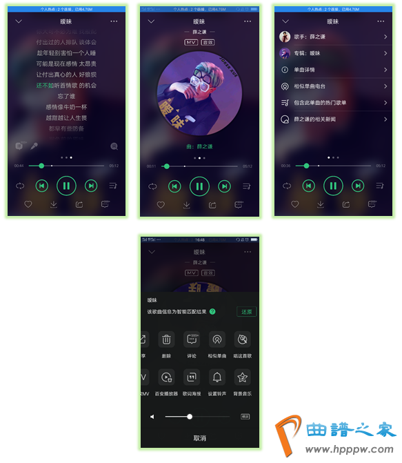 (1)播放器页面功效菜单和歌曲列表背形象保留一律,功效菜单以列表款式展现,与歌单结构气派同一,界面已有的功效按钮不必正在菜单反复闪现如下载、分享、评论等,尽量操纵菜单正在一页内呈现完,无需翻页。点击“评论”按钮后应当返回播放页而不是主导航页。点击“分享”按钮后,光碟连续动弹会有更好的贯通体验。