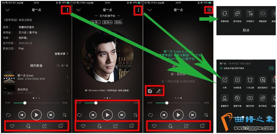 播放模块是由主界面底部悬浮的入口上弹进入(见2、3、4、5四个页面中的播放模块入口),播放页面有三个,如上图,从左到右分为歌曲消息页面、歌曲专辑页面、滚动歌词页面,通过驾驭滑动切换,而且每个页面也嵌套辅帮功效,囊括闭系引荐,歌曲保藏、分享、删除等操作,其它再有弹幕和歌词海报等新意功效,利便用户举行多种听歌体验。