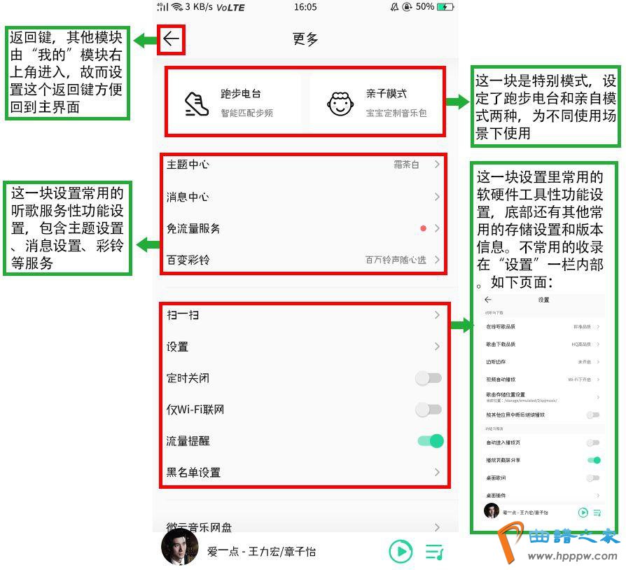 其它一个播放模块,它的特质是不管用户正在哪个页面,下方永远悬停着“正正在播放”的幼播放器,驾驭滑动即可切歌,消重了用户的切换本钱,不至于爆发不耐烦感情,歌曲播放界面筑树了常用功效的入口,填塞思虑了深度用户的需求。