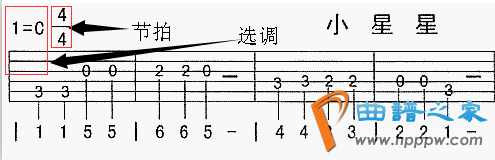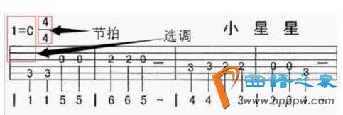通常正在谱的初阶会有选妥协节奏,如图是C调(以C为1)和4/4拍(以四分音符为一拍,每末节有四拍)。