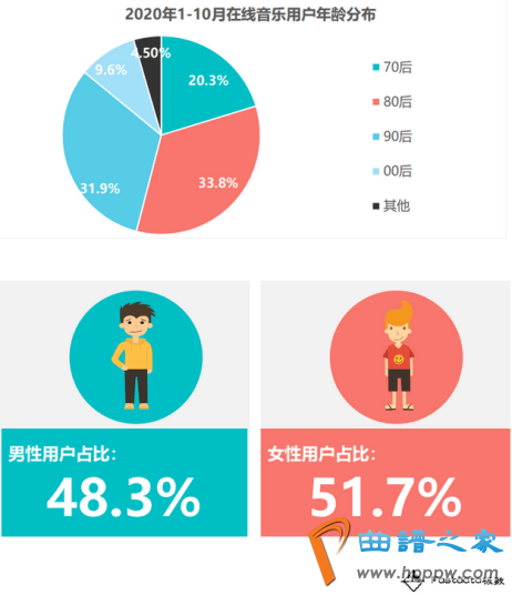 图3 2020年正在线年正在线音笑商场的用户分散图。图数据显示,超6成用户为80后及90后群体,占比跨越65%,除此除表,00后用户也仍旧发展为正在线音笑行业的要紧用户群体。从性别布局上看,男性用户与女性用户占比力为平衡。女性稍高于男性,占比51。7%。