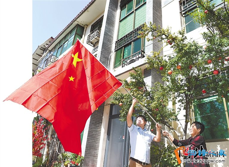 10月1日,平山县西柏坡村民闫二鹏和母亲正在自家幼院里吊挂国旗。 记者赵永辉 张昊摄