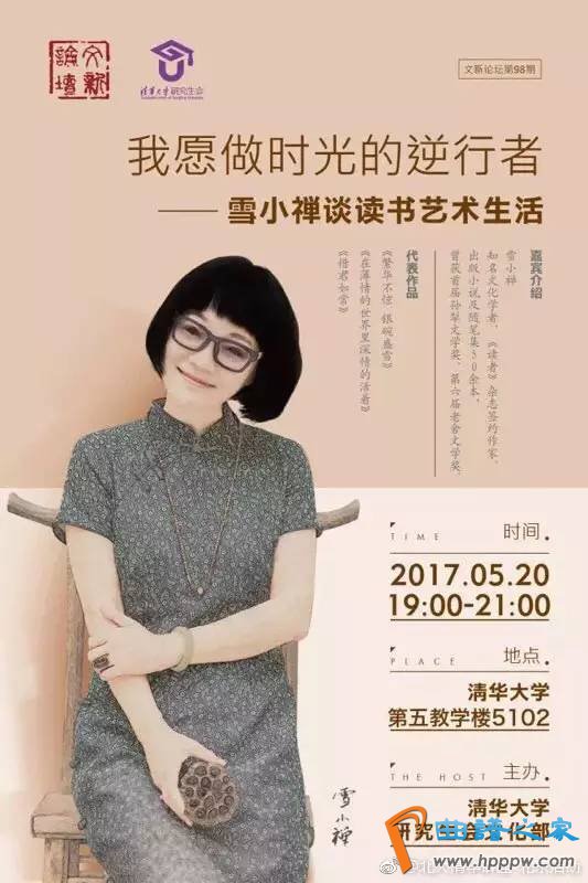 2017年5月20日(周六)19:00-21:00【嘉宾】雪幼禅(热销书作者,着名文明学者,中国慢糊口美学代言人。曾获第六届老舍散文奖、首届孙犁文学奖等多个奖项。被评为“中国搬动”大学讲座情景大使,“中国青年论坛”北京大学讲座嘉宾)【处所】清华大学第五教学楼5102【报名】
