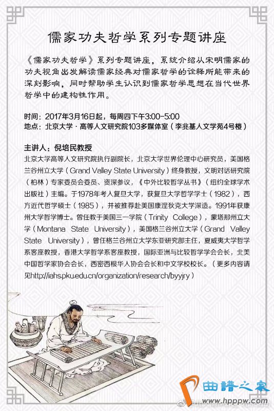 2017年5月18日(周四)15!00—17!00【主讲】倪培民(北京大学上等人文钻探院推广副院长,北京大学宇宙伦理中央钻探员,美国格兰谷州立大学(Grand Valley State University)终生教育,文雅对话钻探院(柏林)专家委员会委员、资深参议。)【处所】北京大学上等人文钻探院103多媒体室(李兆基人文学苑4号楼)
