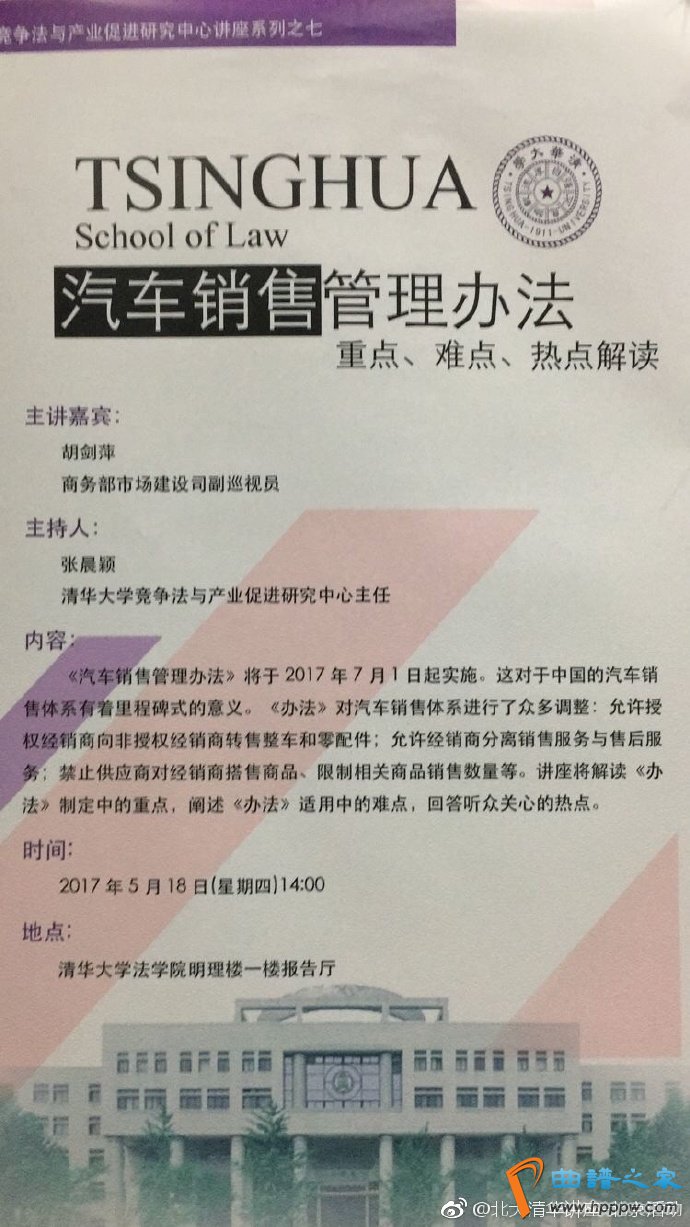 【汽车贩卖处分手段】2017年5月18日(周四)14:00【主讲】胡剑萍(商务部墟市装备司副巡视员)【主办】张晨颖(清华大学角逐法与家当促使钻探中央主任)【处所】清华大学法学院明理楼一楼告诉厅