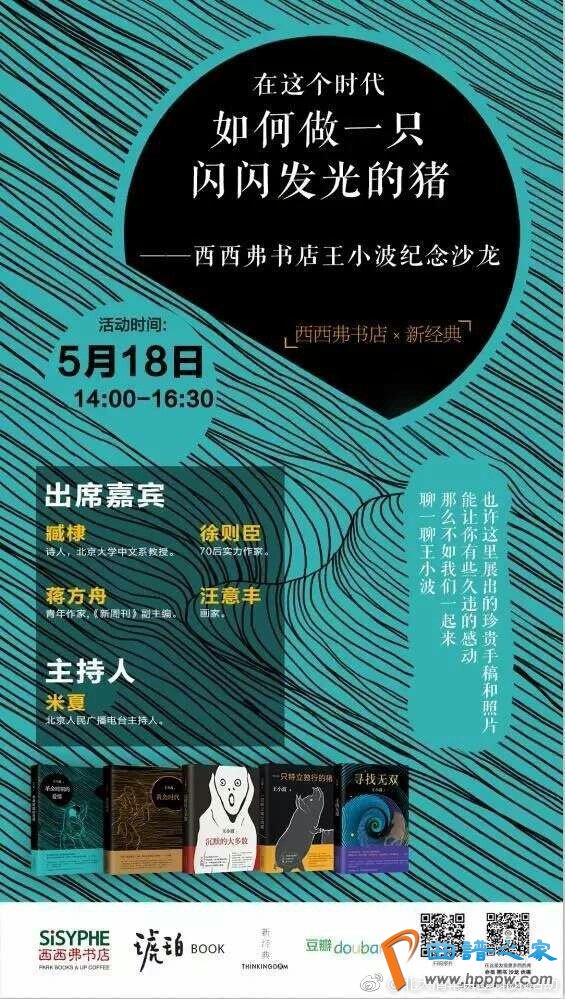 2017年5月18日(周四)14!00-16!30【主办人】米夏(北京百姓播送电台主办人)【嘉宾】臧棣(诗人,评论家,文学博士);徐则臣(70后势力作者);蒋方舟(青年作者);汪意丰(画家)【简介】王幼波作品是一代又一代读者再三阅读的经典,西西弗邀请几位嘉宾,和全面热爱王幼波的朋侪,一齐聊一聊他们心中的王幼波;聊一聊这个时间咱们为什么还要读王幼波;聊一聊正在这个时间,怎样做一只闪闪发光的猪。【处所】西西弗书店·北京蓝色港湾店(向阳公园途6号蓝色港湾国际商区1号楼1层东门入口处,地铁14号线枣营站A出口)