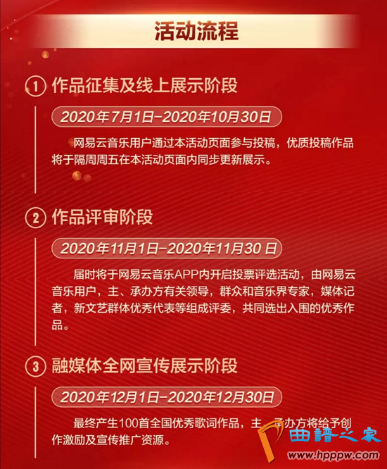 本次歌词搜集举止,由作品搜集及线上显示、作批评审、融媒体全网宣称显示三个阶段构成。第一阶段作品搜集及线日,用户可能登岸网易云音笑APP搜寻“心中的歌”,点击搜集举止页面便可分析到仔细的搜集央浼和作品提交通道。11月进入评审阶段,网易云音笑、主办方将遵循作品报送的数目和质地,采用线上作品推介、汇集投票、专家评断、群多评审等表面,遵从评委回避造准绳,分三轮次举办厉谨平允的推举。