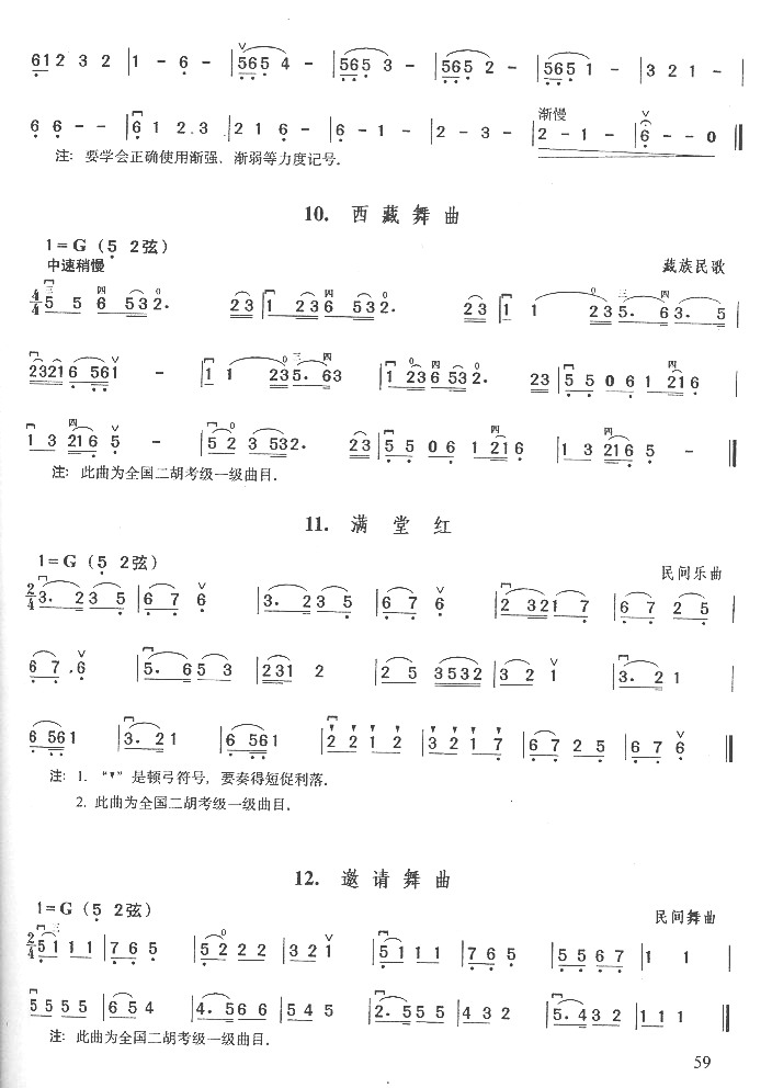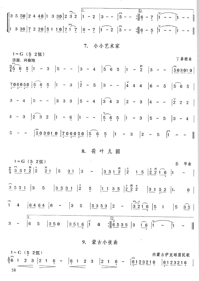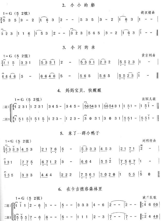 《小小的船.小河的水.妈妈宝贝,快醒醒.来了一群小鸭子.在卡吉德洛森林里.小小艺术家.荷叶儿圆.蒙古小夜曲.西藏舞曲.满堂红.邀请舞曲》二胡谱 未知