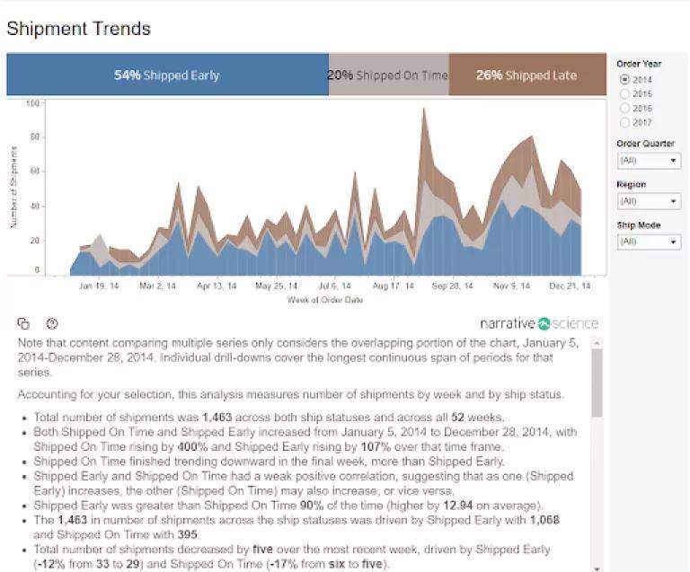Narrative Science与Tableau的结合将改变人们思考、探索和理解数据的方式。故事可以在Tableau中与分析仪表板一起构建、自定义和访问,提供引人入胜的响应式故事来支持视觉效果。