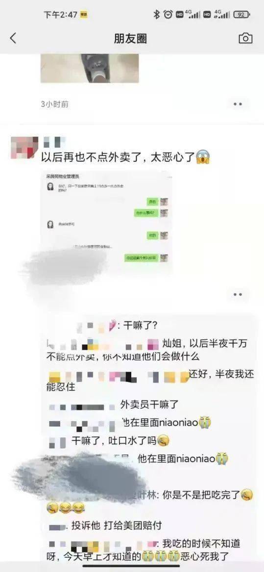 在另一张朋友圈截图内,该业主表示再也不点外卖了。有人留言问她是不是外卖员吐了口水,该业主表示是外卖员在其外卖里小便。
