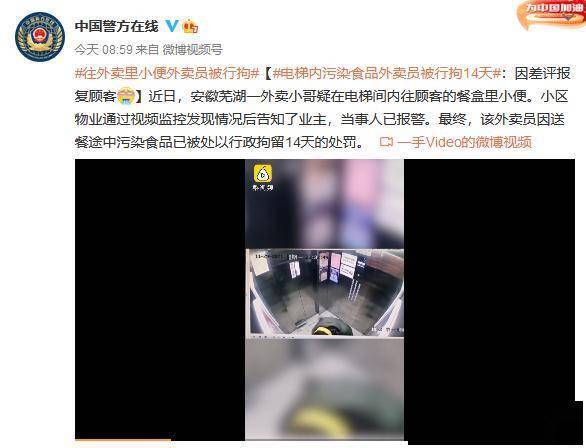 近日,安徽芜湖一外卖小哥疑在电梯间内往顾客的餐盒里小便。小区物业通过视频监控发现情况后告知了业主,当事人已报警。