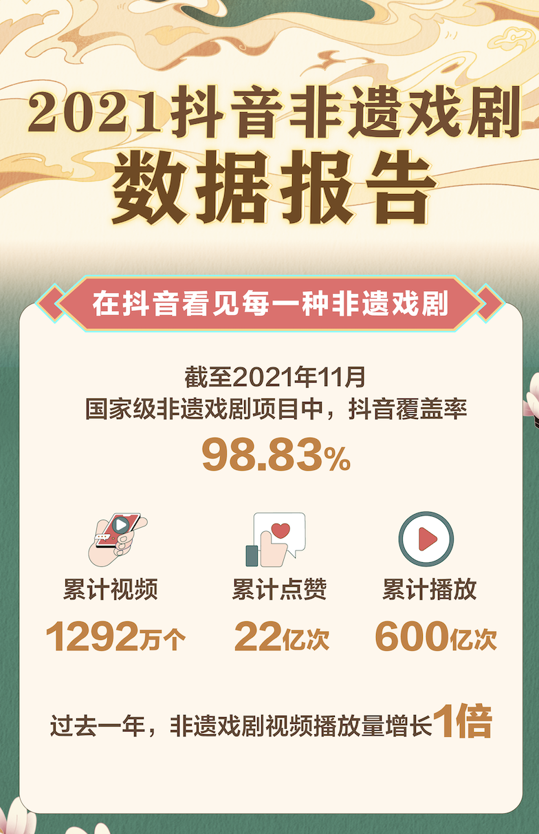 映象网讯(记者 燕子丹)12月1日,抖音发布《2021抖音非遗戏剧数据报告》(以下称“报告”)。报告显示,截至2021年11月,抖音实现覆盖98.83%国家级非遗戏剧项目,非遗戏剧视频累计播放600亿次,累计获赞22亿次。抖音成为网友观看非遗戏剧、学习戏剧知识的重要平台。