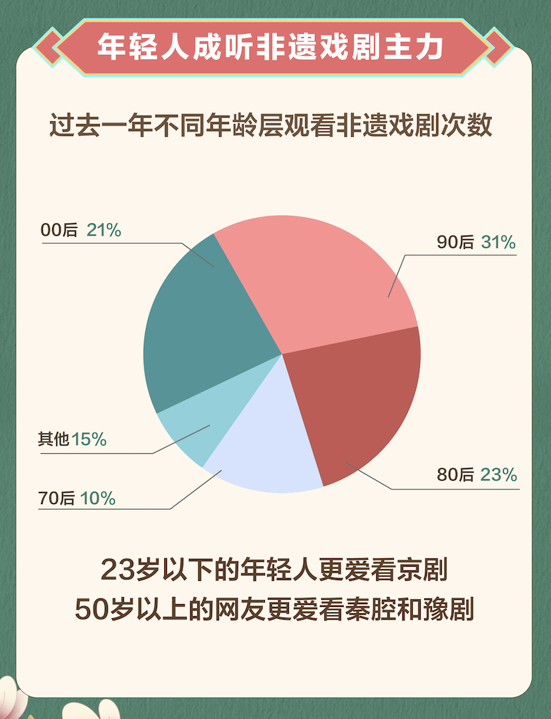 报告显示,90后、00后已经成为抖音听非遗戏剧的主力,占总观众的52%。70后观众仅占10%。其中,河南网友观看非遗戏剧52.31亿次,成过去一年最爱听戏的网友群体。广西网友和云南网友观看量增长208%,成过去一年听戏兴趣增长最快的网友群体。