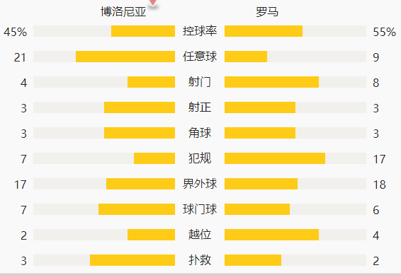 全场比赛结束,罗马最终在客场0-1不敌博洛尼亚。