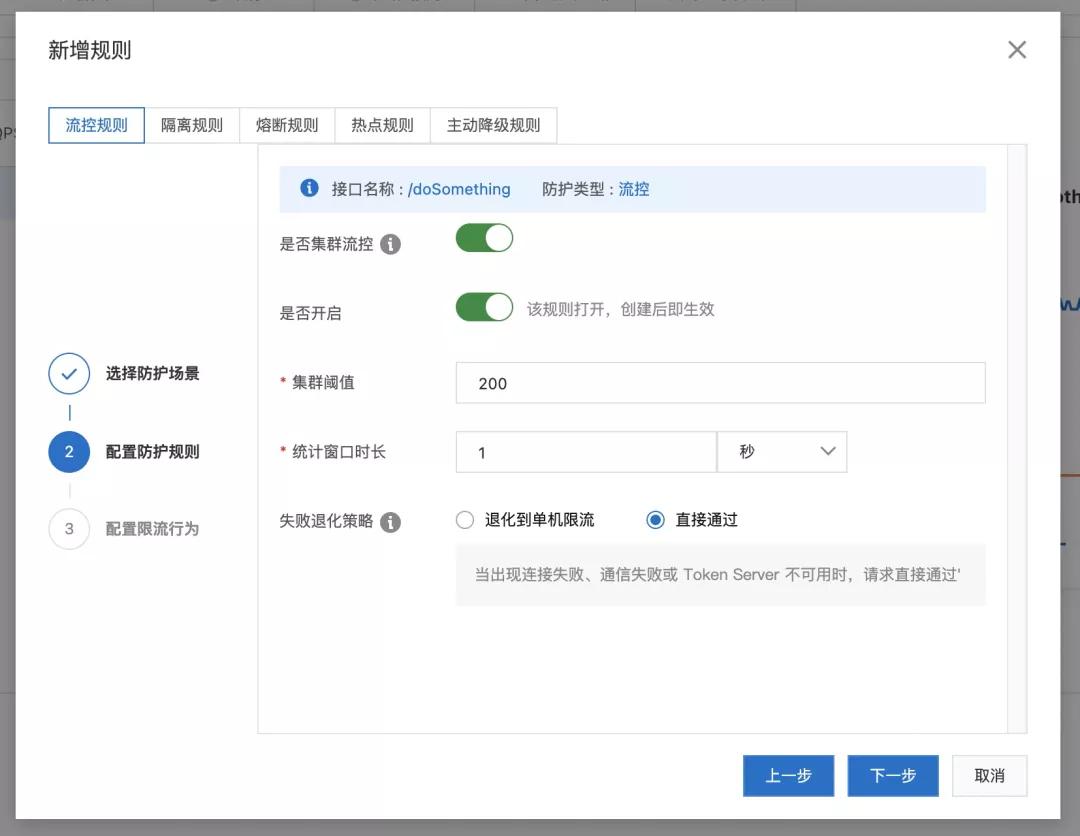 第三步,我们在实时监控页面找一个接口,点击右上角的“+”号,新增流控规则。以下示例中,我们对 /doSomething 这个接口配置集群流控规则,这个接口总的访问量每秒钟不超过 200 次。规则状态为“开启”,代表新增后实时生效。