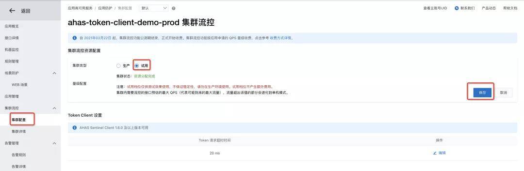 第二步,我们在应用左侧菜单的“集群流控-集群配置”页面,开启集群流控功能。测试应用我们可以开启“试用”集群,不同的集群规格可以承载不同的 QPS 量级: