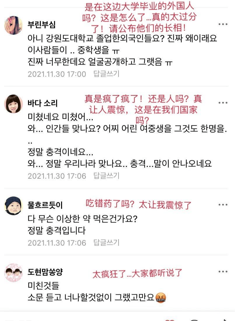 事情发生后,网友表达了震惊和愤怒。在某社交平台的评论区,有网友表示震惊:“我无法理解这种卑鄙的行为!”有韩网友表示愤怒:“我以为我看花了!这些人是不是疯了?”除此之外,也有网友称这无疑给韩国国内那些认为“外国人都很坏”的人提供“弹药”。