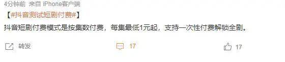 近日,据界面新闻、潇湘晨报等多家媒体报道,有消息表示,抖音正在测试短剧付费功能。据了解,抖音短剧的付费模式与付费小说类似,是按集数进行付费,每集最低1元起,支持一次性付费解锁全剧。付费后的短剧可重复观看,且无时间限制。
