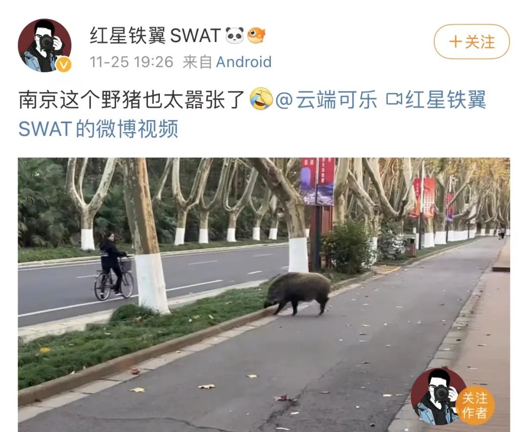 今年关于国内野猪的热搜中, 南京占据了半壁江山,这让野猪一举超越鸭子成为南京驰名特产。野猪围城下,南京网红也成了野猪播报bot:
