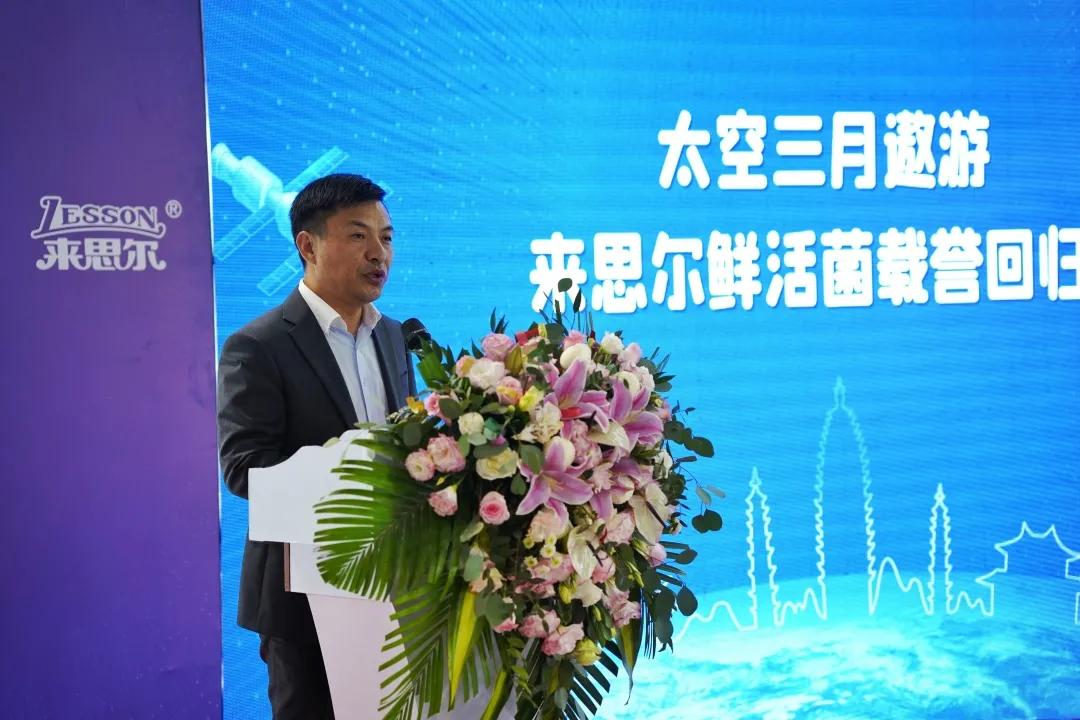 2021年9月27日,在北京中国载人航天办公室举行的神舟十二飞船返回舱开舱及搭载物交接仪式上,皇氏来思尔总经理马万平亲自赴京,迎接顺利从太空凯旋归来的22株鲜活菌。