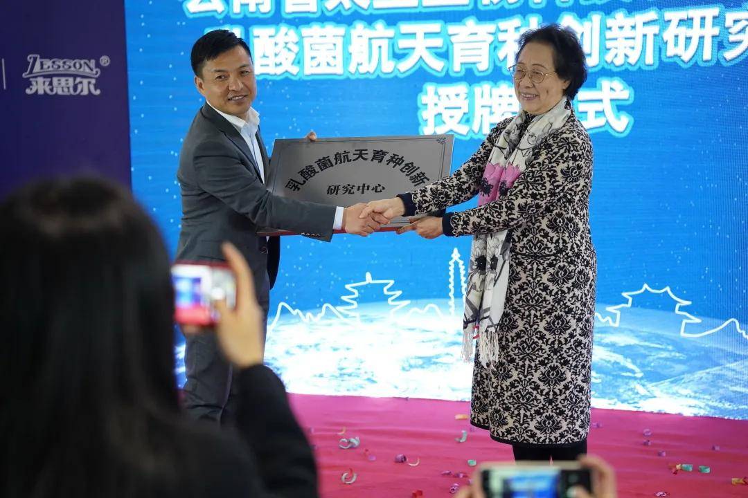 同时进行的还有“乳酸菌航天育种创新研究中心”授牌仪式,云南省太空生物科技发展促进会会长杨琴媛为云南皇氏来思尔乳业有限公司授予“乳酸菌航天育种创新研究中心”,皇氏来思尔总经理马万平上台接牌。
