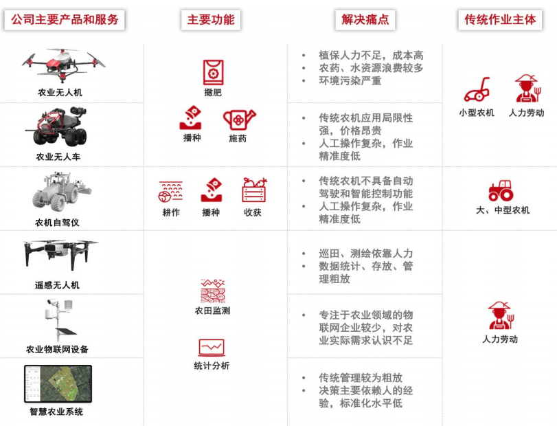 极飞科技自2013年开始农业科技领域调研,并于2015年推出第一代植保无人机,进入直营植保服务阶段;随后公司开始推出系列多款农业无人机,迈入农业无人机销售阶段。2019 年以来,公司战略重心逐步向构建产品生态和提升客户服务倾斜,开始提供涵盖硬件+软件+服务的智慧农业整体解决方案。