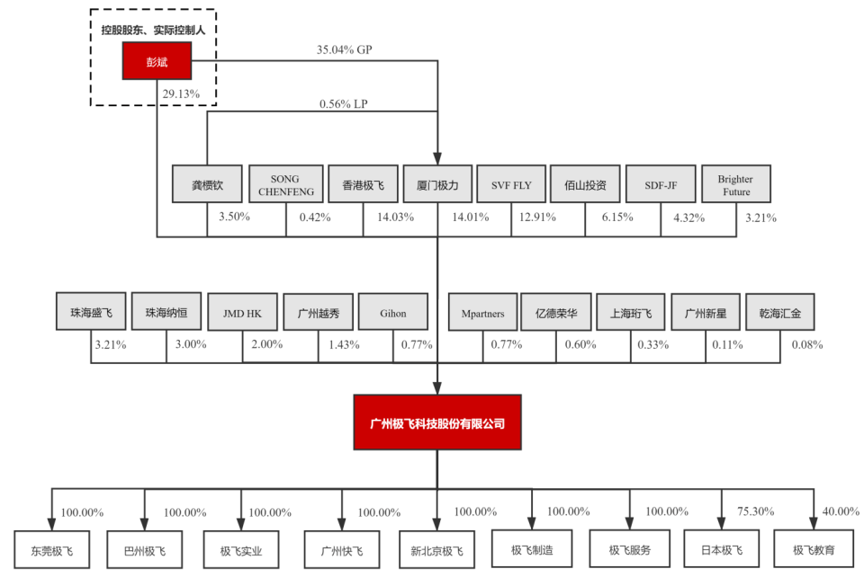 招股书显示,极飞科技创始人彭斌直接持有公司29.13%股份,并作为厦门极力(员工持股平台)的普通合伙人兼执行事务合伙人间接控制公司14.01%的股份,即合计控制公司表决权比例为43.14%,为公司控股股东和实控人。
