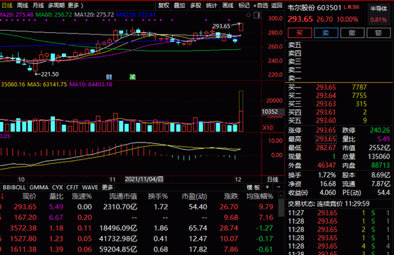 A股个股方面,近段时间股价表现比较平淡的A股芯片龙头韦尔股份突然暴涨,并很快封住涨停。在此之前较长一段时间,韦尔股份都在横盘震荡。