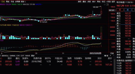 在股价冲击涨停的同时,韦尔股份发行的可转债也出现一波急升,韦尔转债盘中一度暴涨超过13%。