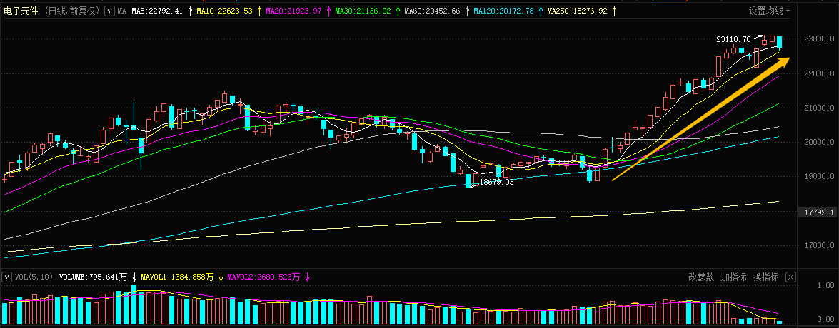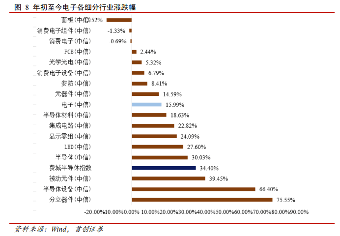 对于电子行业板块的强势,首创证券分析师何立中、韩杨在今日发布的电子行业简报中表示,年初至今,电子细分行业涨幅前五的板块分别为分立器件、半导体设备、被动元件、半导体和 LED,涨幅分别为 75.55%、66.40%、39.45%、30.03%和 27.60%。推荐关注国内消费电子产业链公司光弘科技、信濠光电、比亚迪电子、深科技、环旭电子等。