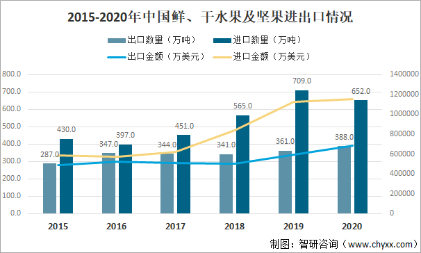 2020年中国鲜、干水果及坚果进口数量为652万吨,同比下降8%;进口金额为1156494.7万美元,同比增长2.5%;中国鲜、干水果及坚果出口数量为388万吨,同比增长7.5%;出口金额为683226.5万美元,同比增长14.7%。