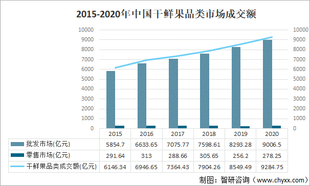 果干是鲜果的加工制品,由各种水果经过日晒、烘干或是冻干而成.水分在12%以内,便于保存,供直接食用。据国家统计局数据,2020年中国干鲜果品批发市场成交额约为9006.5亿元,同比增长8.6%;干鲜果品零售市场规模约为278.25亿元,同比增长8.6%。
