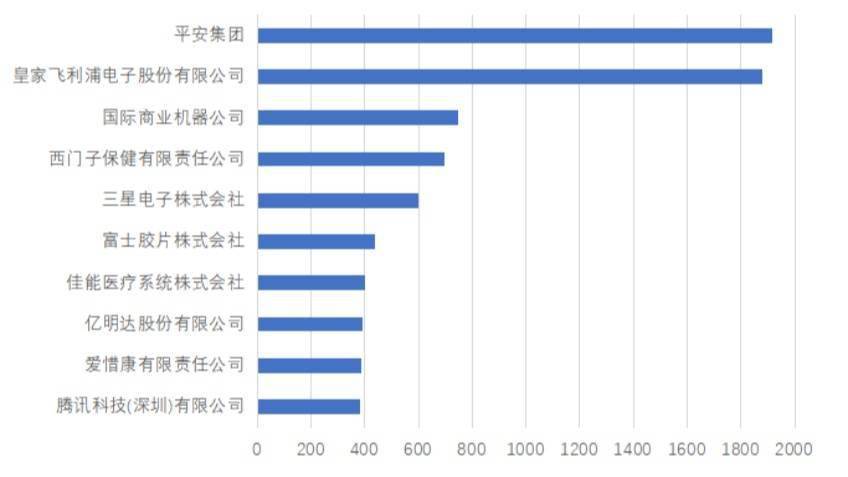 根据专利数据统计,在过去 4 年数字医疗领域全球专利申请数量最多的 10 家公司分别是平安集团(中国)、皇家飞利浦电子股份有限公司(荷兰)、腾讯科技(深圳)有限公司(中国)、国际商业机器公司(美国)、西门子保健有限责任公司(德国)、三星电子株式会社(韩国)、亿明达股份有限公司(美国)、富士胶片株式会社(日本)、佳能医疗系统株式会社(日本)、爱惜康有限责任公司(美国)。其中,有 8 家公司来自国外,2 家来自中国。