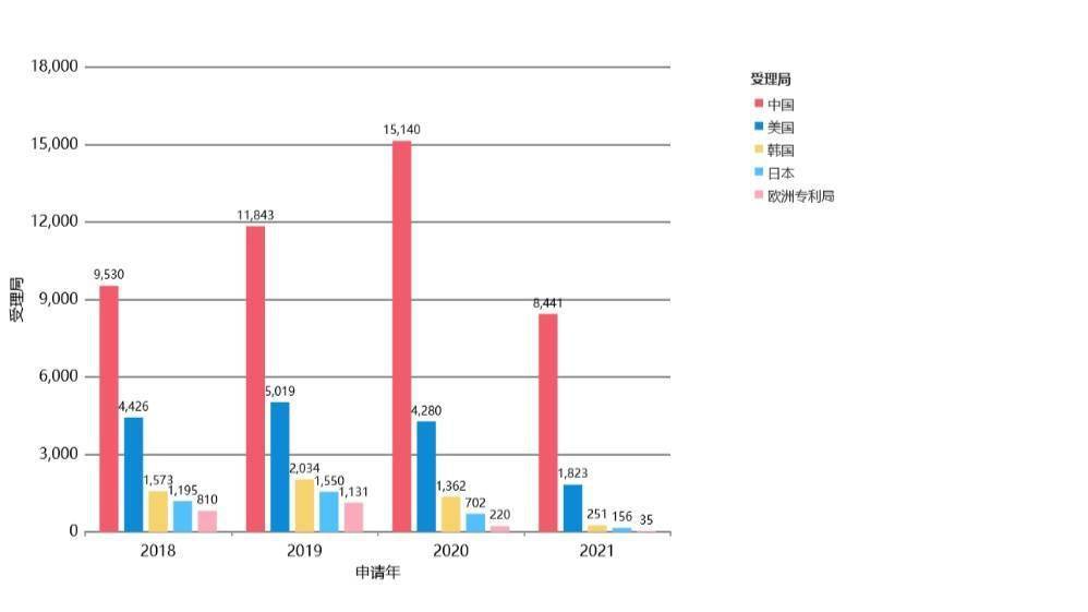 图2: 2018~2021年10月数字医疗专利申请量排名前5国家