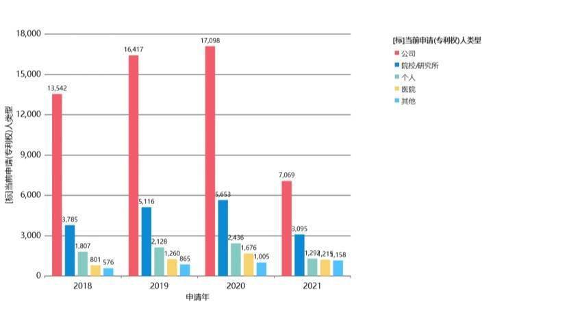 过去4年(2018~2021年10月),全球共申请了8.4万件数字医疗相关专利,其中企业申请占比最高,申请量为5.41万件,院校/研究所为1.76万件,个人为0.77万件,医院为0.5万件。