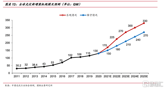 根据最新的数据显示,美国2021年1-7月累计新增装机15.69GW,同比增长43.30%,并且截至2021Q2末,美国已签PPA规模达到85GW,预示着装机量将再创历史新高。根据长江证券研究报告预测,2021年海外装机维持110GW左右判断。而国联证券研究所的研究报告指出,预期全球光伏年新增装机规模在2025年底将达约270-330GW,对应2021-2025年的复合增长速度或将处于15.7%-20.5%这一区间。