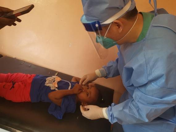 王国军为苏丹当地儿童病患诊疗。(医疗队王国军供图)