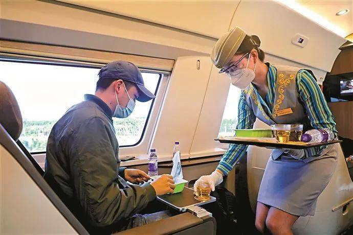 列车还设置了餐吧区,大大拉近旅客与美食的距离。据列车员介绍,正式通车后她们在车上还会提供只在高铁上出售的“高铁奶茶”,乘客在座位上或者去餐车就可点上一杯。